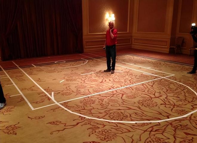 助教团队会用运动胶带在宴会厅地板贴出篮球场界线(合理冲撞区、三分线等)。球员穿着拖鞋、凉鞋下楼,一步步演练战术跑位和对手应对方式。