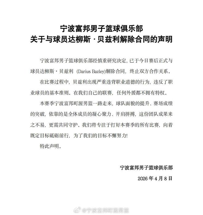 宁波富邦男子篮球俱乐部经慎重研究决定,已于今日赛后正式与球员达柳斯-贝兹利解除合同,终止双方合作关系。