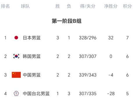 B组四轮过后,日本队3胜1负稳居第一,韩国队、中国队都是2胜2负,中国队净胜分落后4分,仍然排名第三,中国台北队1胜3负稳居垫底。尽管排名没有变化,但晋级形势再度有变,中国队形势柳暗花明。