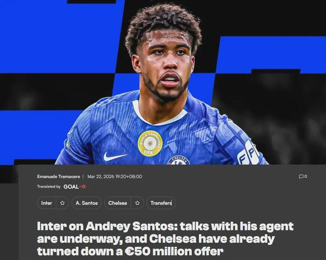 报道称,国米最近已经多次会见了贝尔托鲁奇以及霍拉布钦,此二人和桑托斯的经纪人团队关系密切,但此事目前尚无进展,因为切尔西将这名中场视为了一线队的一员,而且他们的要价非常高,罗马诺表示他们甚至拒绝过沙特球队5000万欧元的报价,这已经远超市场价。
