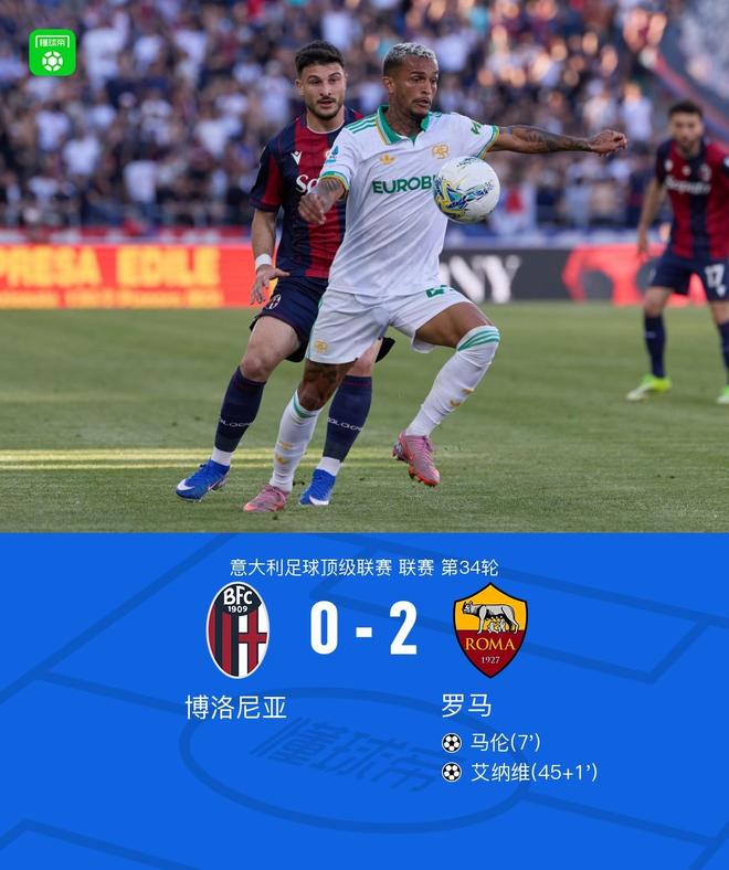 北京时间4月26日意大利足球顶级联赛第34轮,博洛尼亚主场对阵罗马。上半场马伦首开记录,艾纳维破门扩大领先优势。最终比分博洛尼亚0-2罗马。