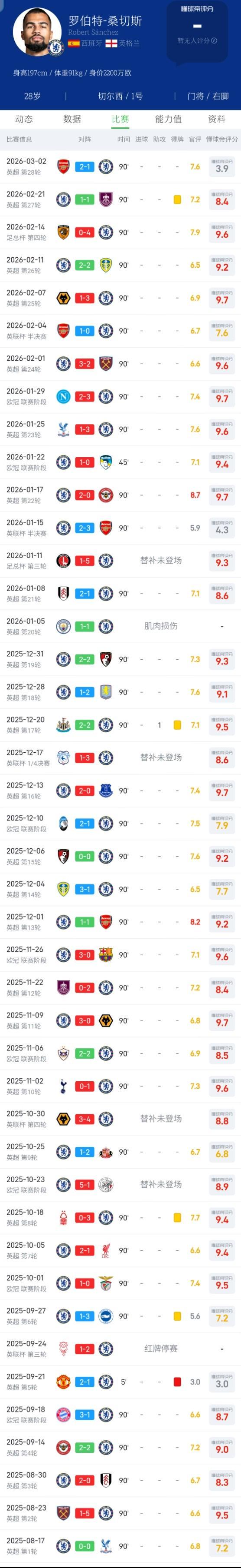 在北京时间2026年1月15日,英联杯半决赛首回合的比赛中,桑切斯出现两次失误,导致切尔西2-3失利。而在本场比赛中,桑切斯面对阿森纳的角球战术时再次失误,在两次失球中负有不可推卸的责任,导致切尔西1-2失利。此外,桑切斯本场比赛还有多次传球失误,着实让切尔西球迷心跳加速。